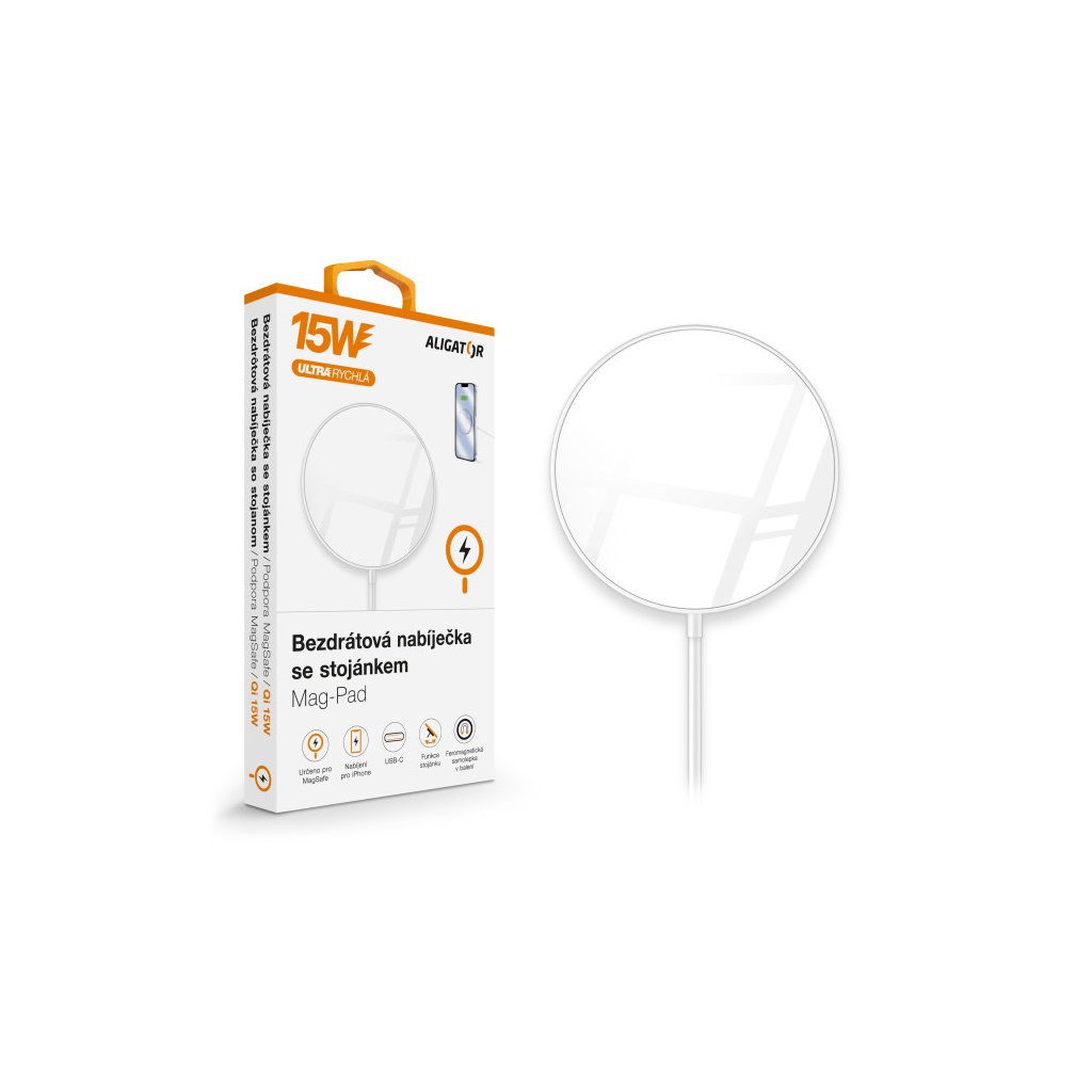 Kompaktní zpracování v elegantní bílé barvě se zářivě lesklým povrchem, praktickým stojánkem a 1m dlouhým přívodním USB-C kabelem, to je bezdrátová nabíječka Aligator Mag-Pad. Součástí balení je také feromagnetická samolepka, díky které můžete rozšířit kompatibilitu u pouzder, které tuto technologii nepodporují.