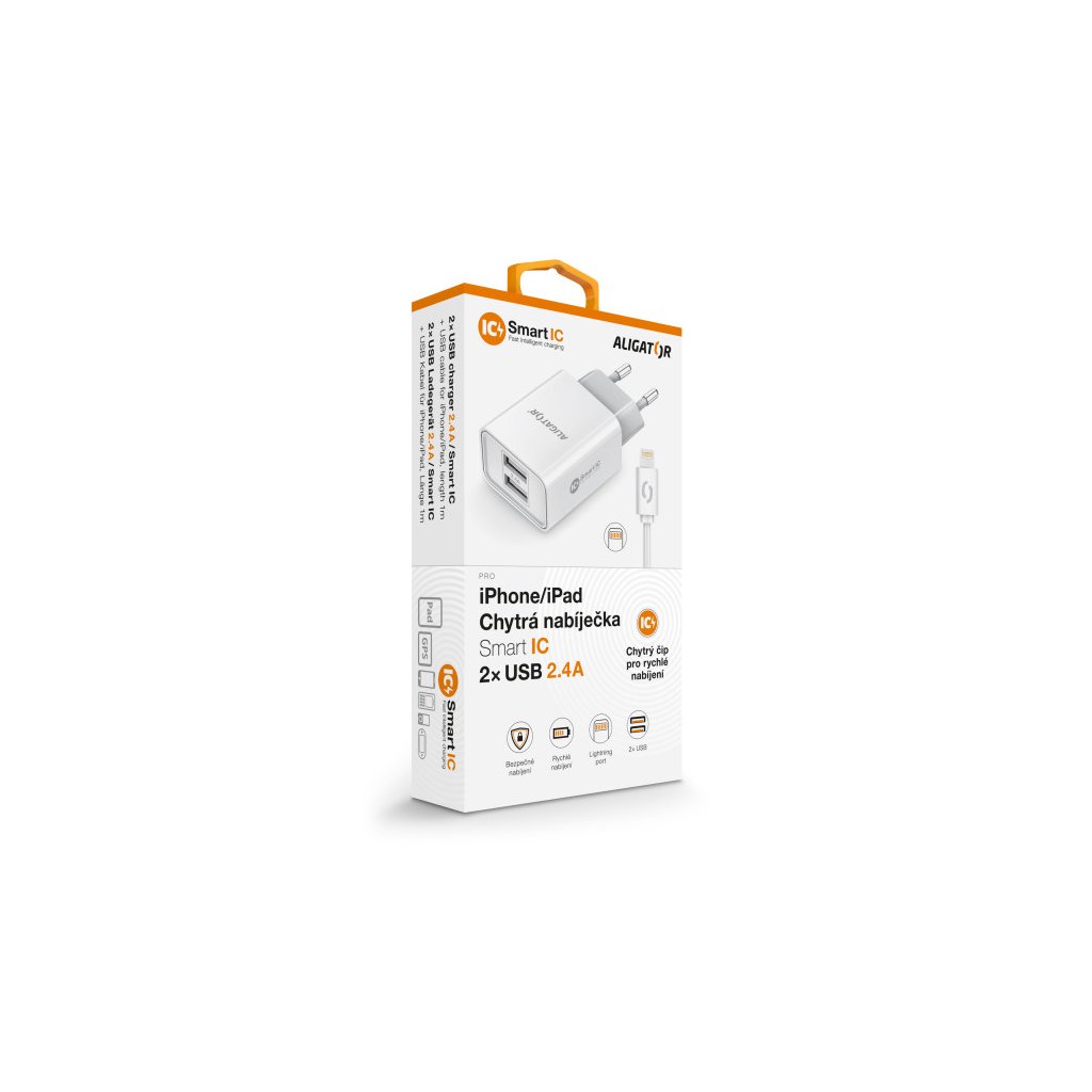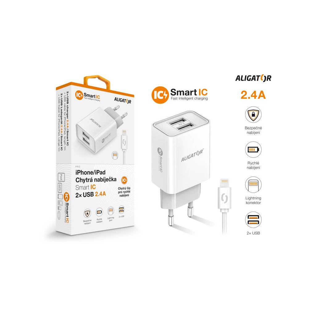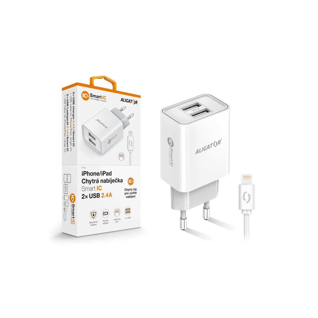 Chytrá síťová nabíječka ALIGATOR 2.4A, 2xUSB, smart IC, bílá, kabel pro iPhone/iPad 2A