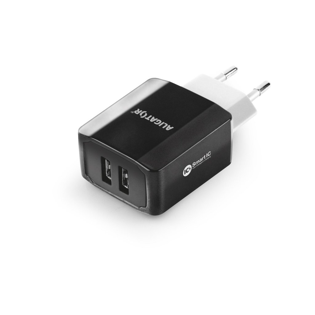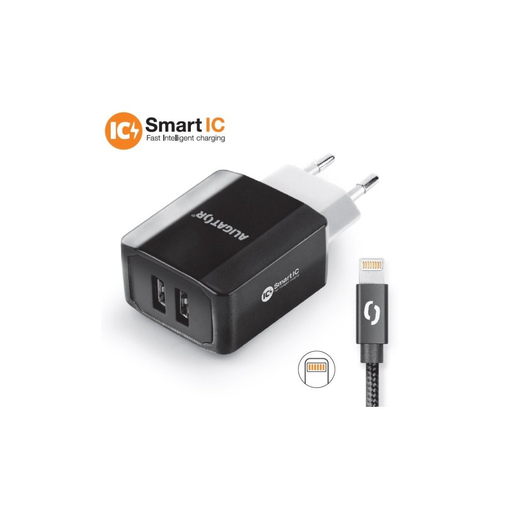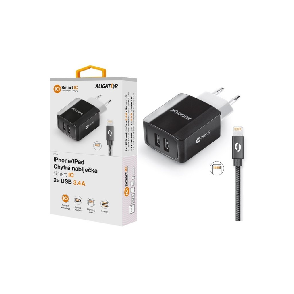 Chytrá nabíječka ALIGATOR 3.4A, 2xUSB, s kabelem pro iPhone/iPad, Smart IC, černá