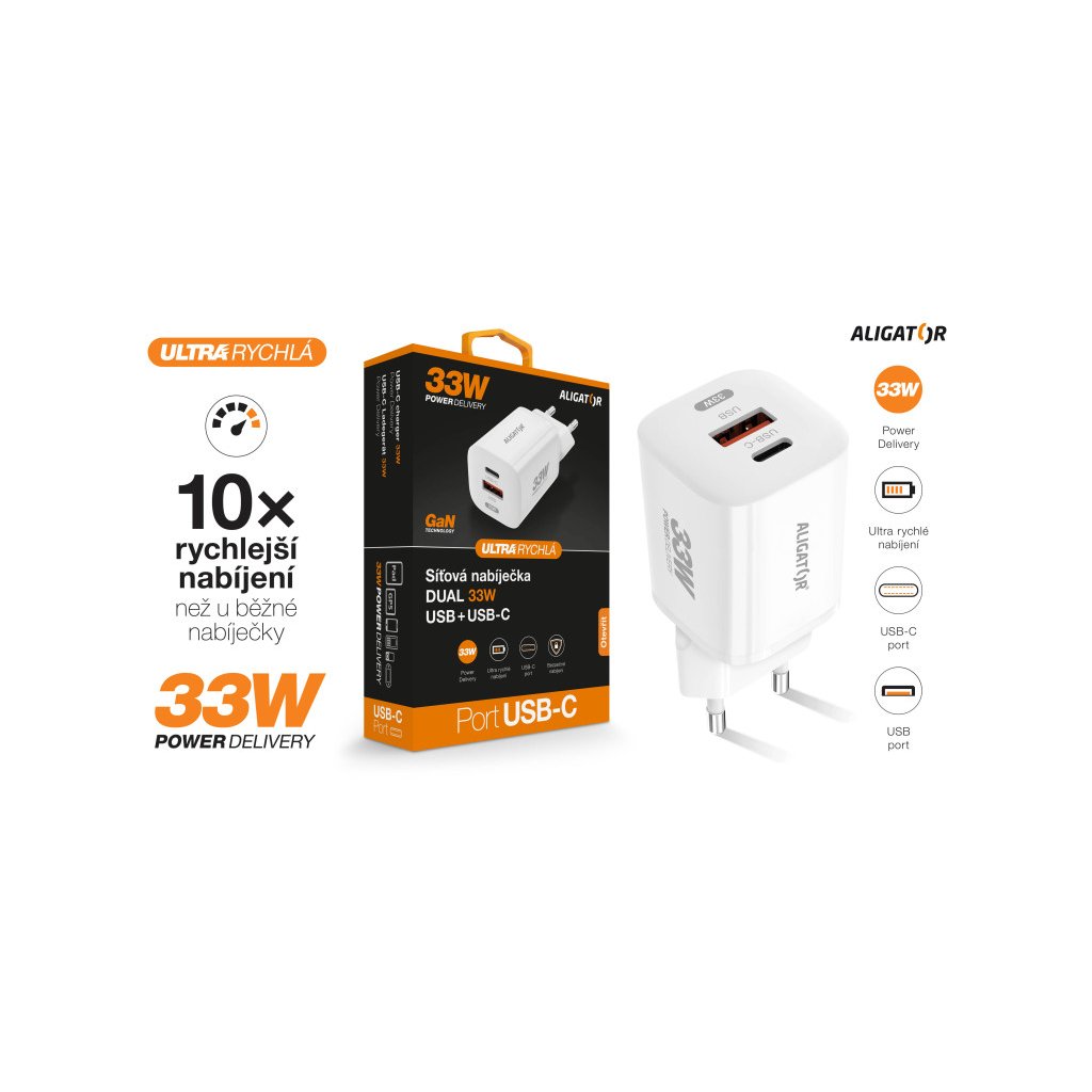 Rychlá GaN síťová nabíječka USB-C + USB ALIGATOR Power Delivery 33W