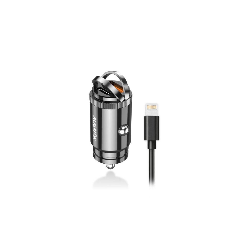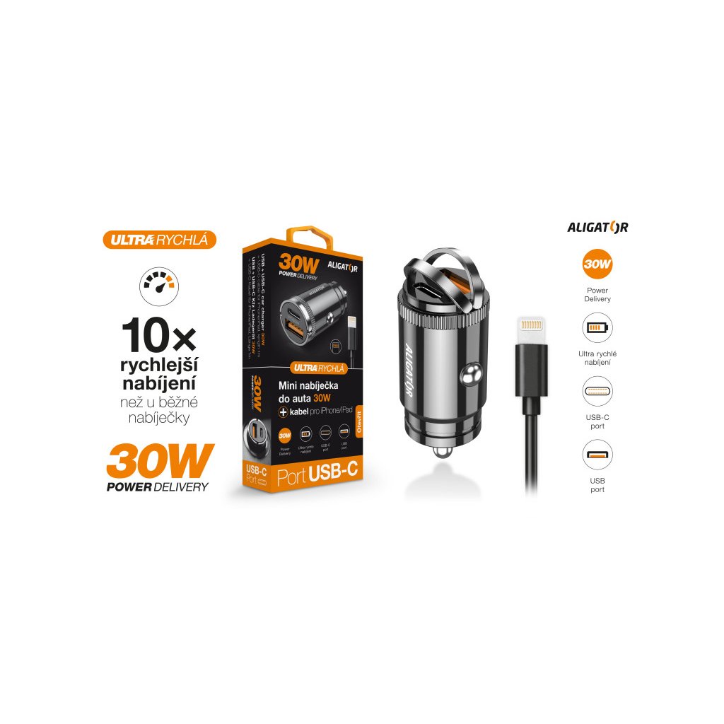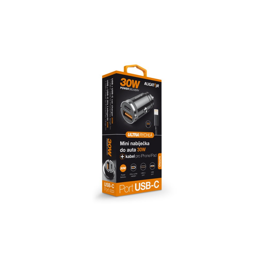 Chytrá Mini nabíječka do auta ALIGATOR Power Delivery 30W, USB-C + USB-A, USB-C kabel pro iPhone/iPad