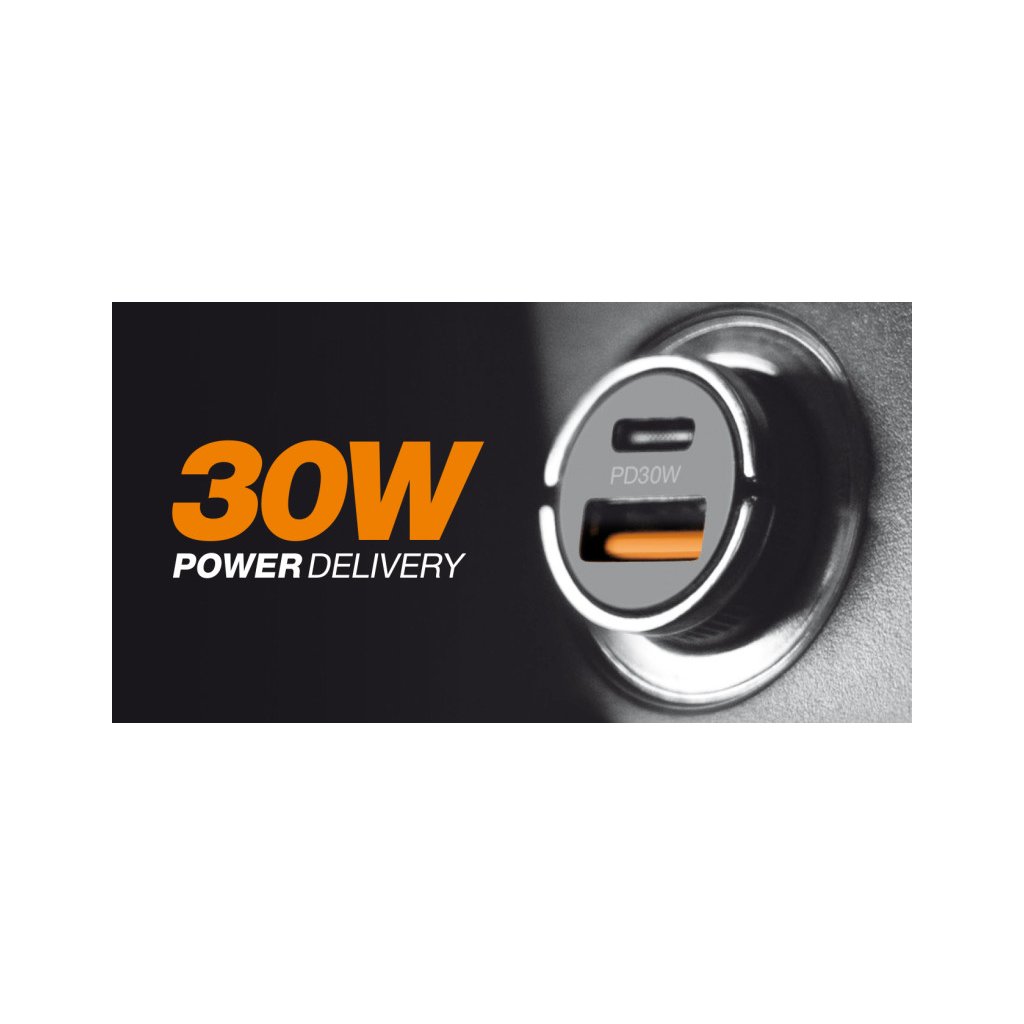 Výkonná miniaturní nabíječka do auta řady „POWER DELIVERY“ v elegantním kovovém provedení s USB-A portem a ultra rychlým USB-C portem o výkonu 30W.