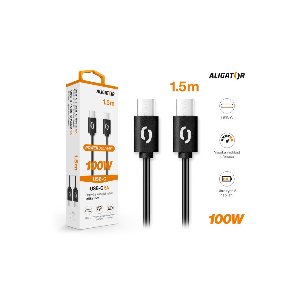 Datový kabel ALIGATOR POWER 100W, USB-C/USB-C 5A, 1,5m černý