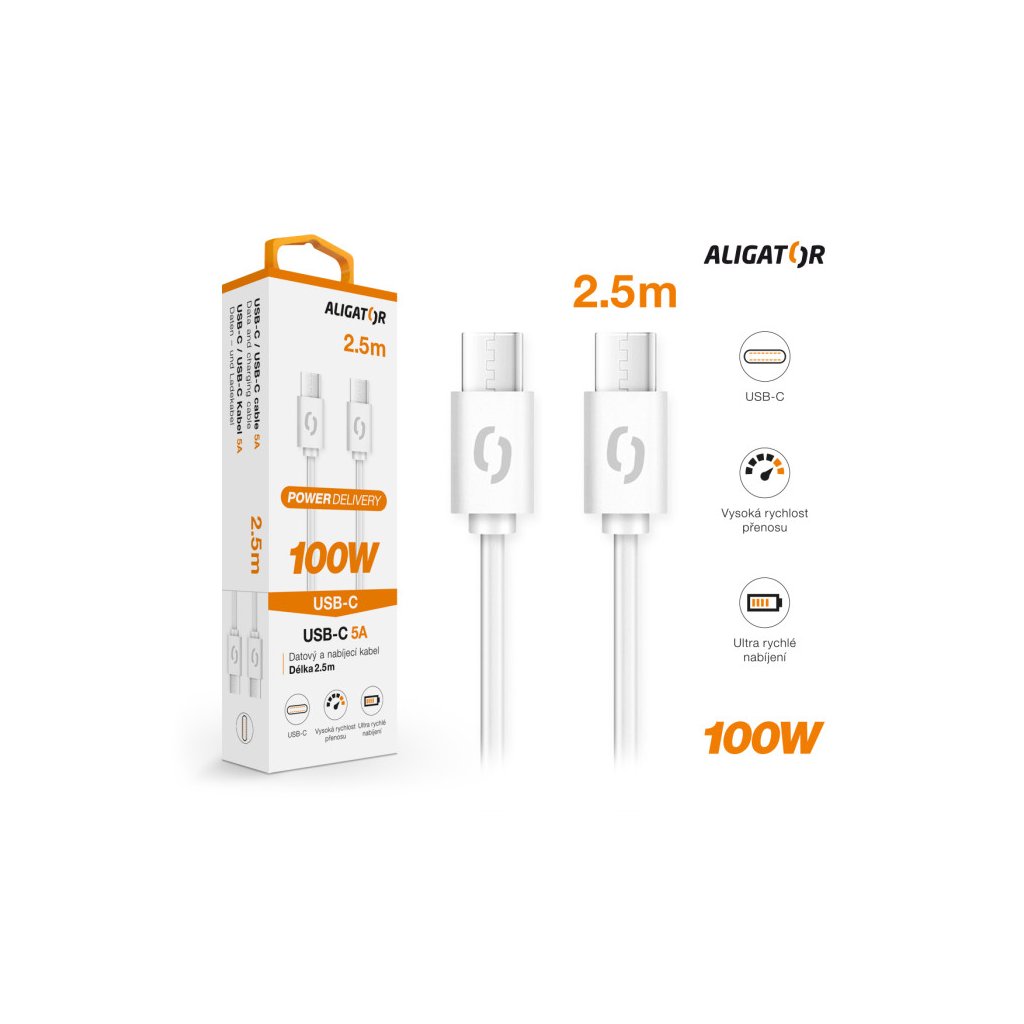 Datový kabel ALIGATOR POWER 100W, USB-C/USB-C 5A, 2,5m bílý