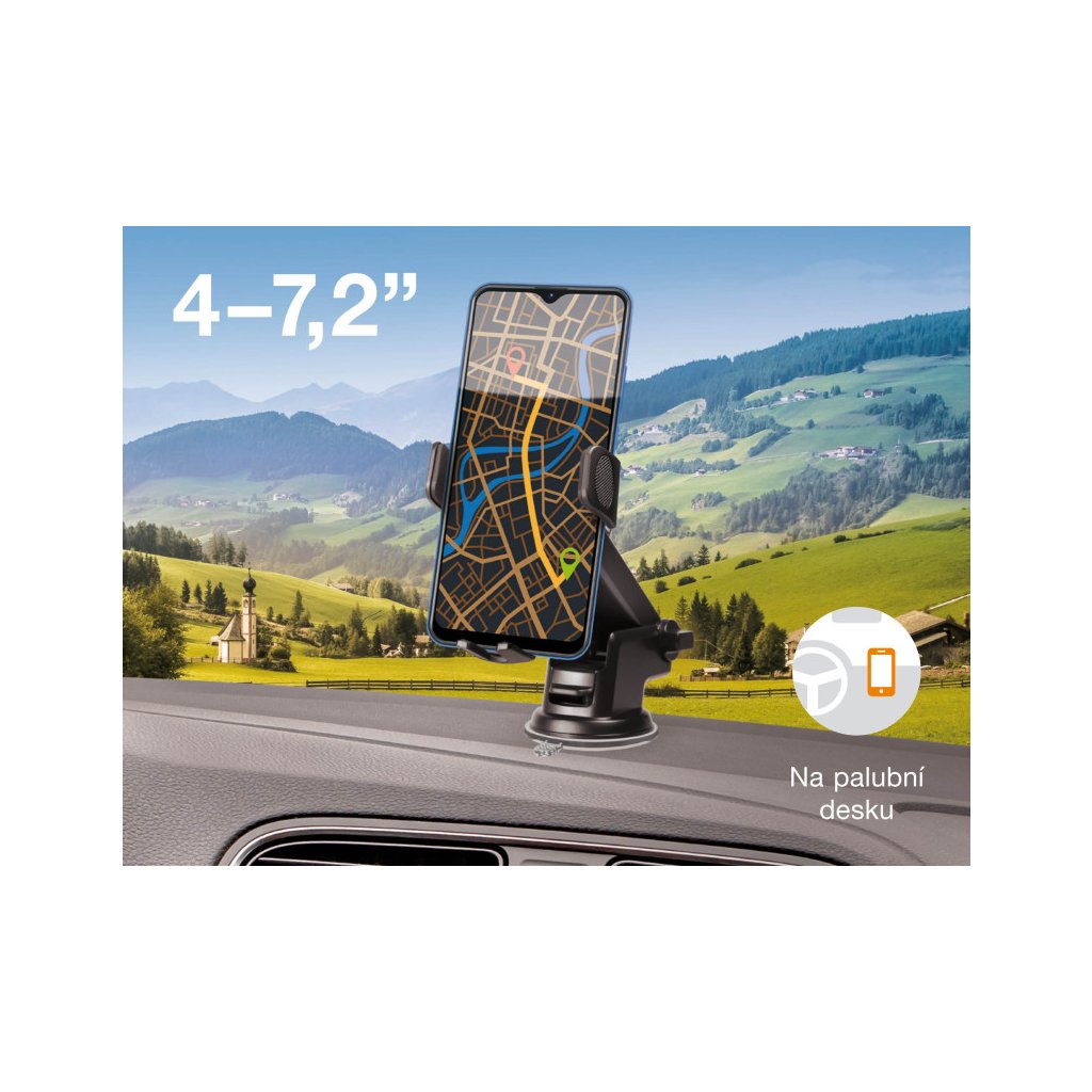 Univerzální držák pro mobilní telefony do auta s možností nastavení fixace. Pomocí vestavěné nano-podložky lze držák umístit na palubní desku i na čelní sklo.