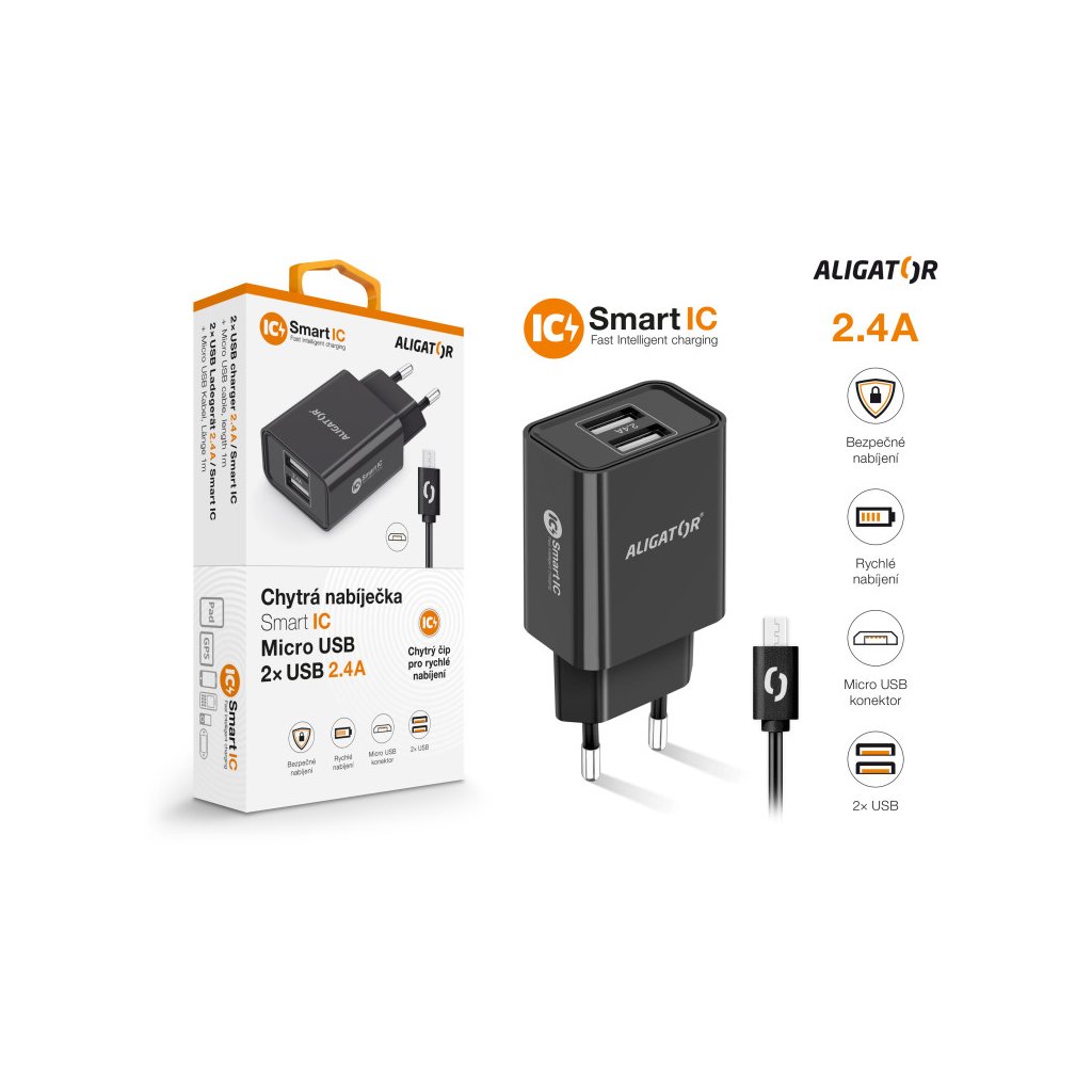ALIGATOR Charger, Micro USB, 2xUSB output, smart IC, black