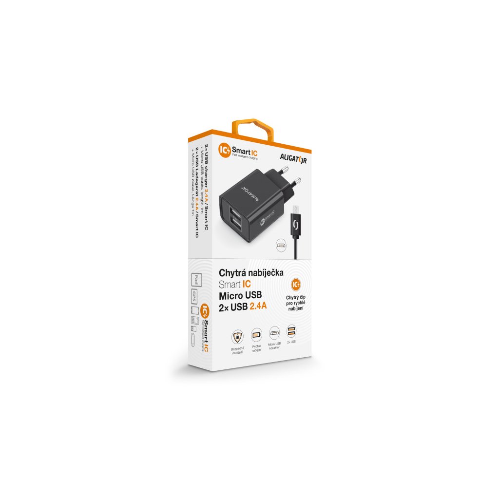 Smart mains charger ALIGATOR 2.4A, 2xUSB, smart IC, black, Micro USB cable 2A