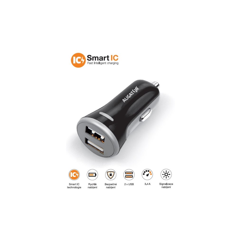 ALIGATOR 3.4A okos autós töltő, 2xUSB, smart IC, fekete