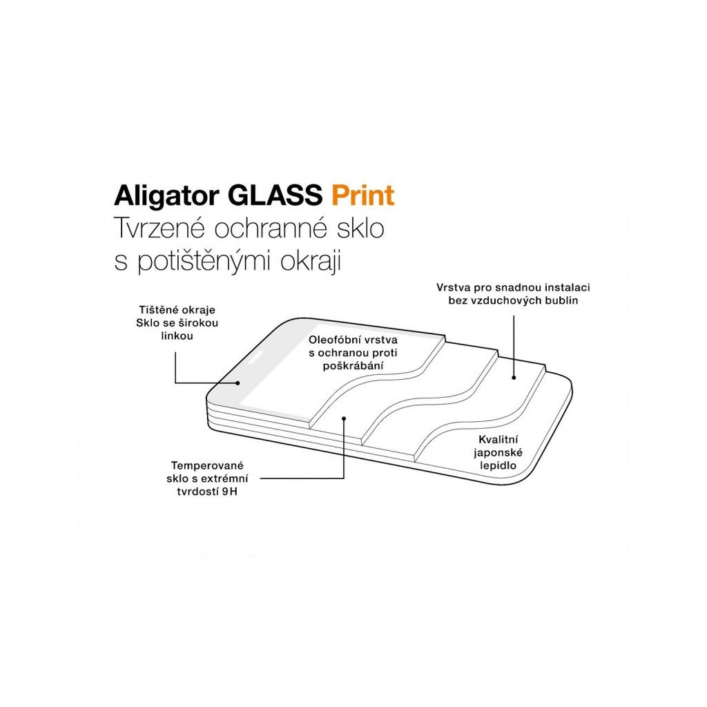 Ez a védőüveg két rétegből áll. Az egyik réteg egy vékony, tartós edzett üveg, a második réteg pedig egy speciális fólia, amely biztosítja az üveg tökéletes tapadását a telefon kijelzőjéhez. Az egyedülálló technológiának köszönhetően nem hagy buborékokat, és észre sem veszi a megbízható képernyővédő jelenlétét. Az Aligator Glass Print nyomtatott élekkel rendelkezik, amelyek lehetővé teszik, hogy az üveg a kijelző teljes felületét befedje.