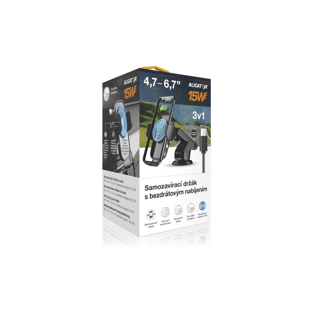 Samozavírací držák do auta ALIGATOR s bezdrátovým nabíjením 15W, 3v1